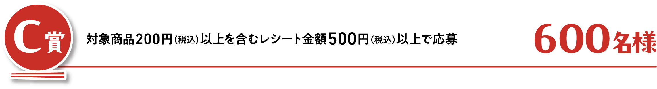 期間中に対象店舗にて、対象商品を含む合計金額がA賞は3,000円(税込)以上※内対象商品500円(税込)以上、B賞は1,000円(税込)以上※内対象商品300円(税込)以上、C賞は500円(税込)以上※内対象商品200円(税込)以上のご購入のレシートでご応募いただけます。