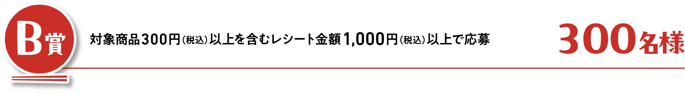 期間中に対象店舗にて、対象商品を含む合計金額がA賞は3,000円(税込)以上※内対象商品500円(税込)以上、B賞は1,000円(税込)以上※内対象商品300円(税込)以上、C賞は500円(税込)以上※内対象商品200円(税込)以上のご購入のレシートでご応募いただけます。